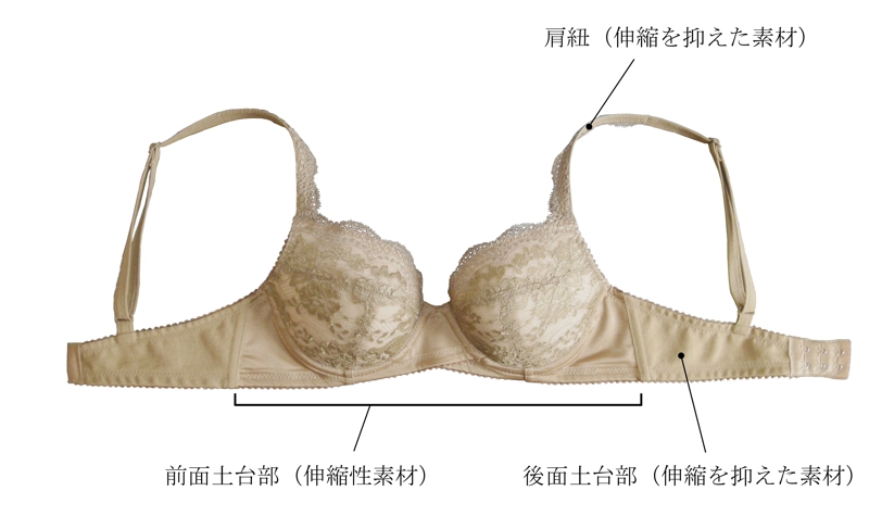ここでいう「従来のブラジャー」とは、前面土台部に伸縮を抑えた素材を用い、肩紐と後面土台部には伸縮性素材を用いた構成を特徴とするブラジャーを指します。